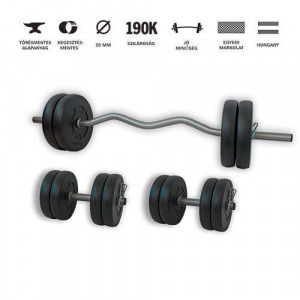 Univerzális, több készlet készíthető. A tárcsákat le-fel tudja helyezni a súlyzó rúdon.