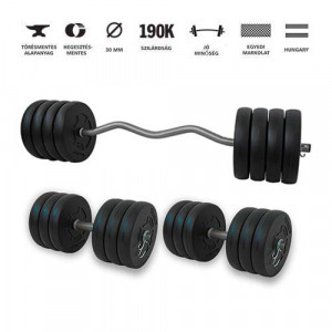 Univerzális, több készlet készíthető. A tárcsákat le-fel tudja helyezni a súlyzó rúdon.
