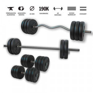 Univerzális, több készlet készíthető. A tárcsákat le-fel tudja helyezni a súlyzó rúdon.