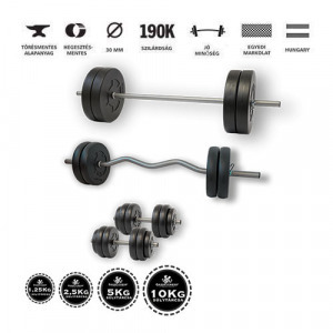 Univerzális, több készlet készíthető. A tárcsákat le-fel tudja helyezni a súlyzó rúdon.