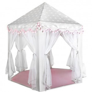 A gyermeksátor jó módszer kreatív és ötletes szórakozásra beltéren és kültéren egyaránt. Serkenti a képzeletet, és lehetővé teszi, hogy boldogan töltsön időt egyedül vagy egy nagyobb csoportban, korhatár nélkül. A bejáratokat félig átlátszó fehér függönyök borítják, amelyek tökéletesen beleolvadnak a sátor többi részébe. A függönyök dekoratív szalagokkal különböző módon köthetőek össze.