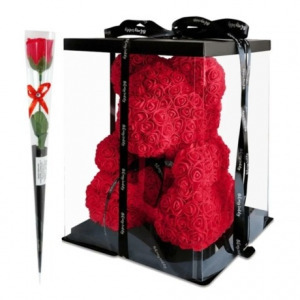 Rózsa maci díszdobozban 40 cm - piros + 1 szál szappan rózsa